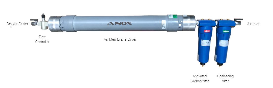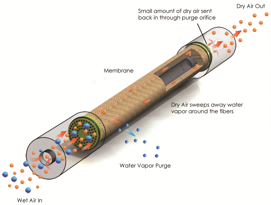 Typically the compressed air is first filtered with high-quality coalescing filter and activated carbon filter. These filters remove liquid water, oil and particulate from moist compressed air. The water vapor-laden air then passes through the center bore of hollow fibers in the membrane bundle. At the same time, a small portion of the dry air product is redirected along the outside surface of the fibers to sweep out the water vapor which has permeated the membrane.