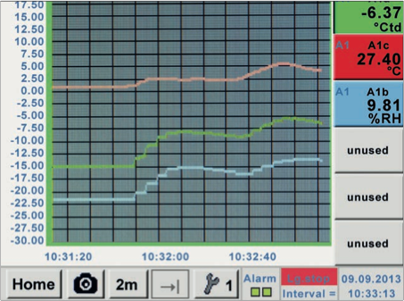 In the graphic view all measured values are indicated as curves. It is possible to browse back on the time axis by a slide of the finger (without data logger maximum 24 hours, with data logger back to the start of the measurement).
