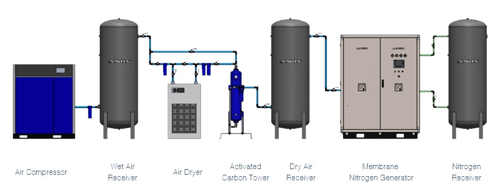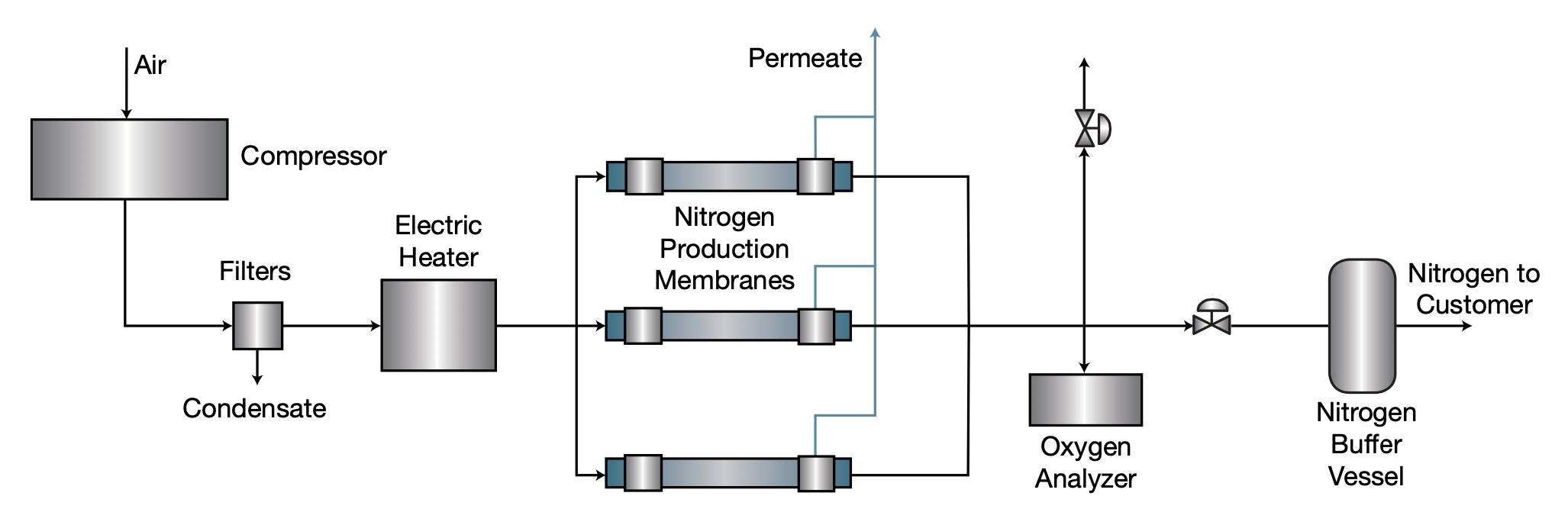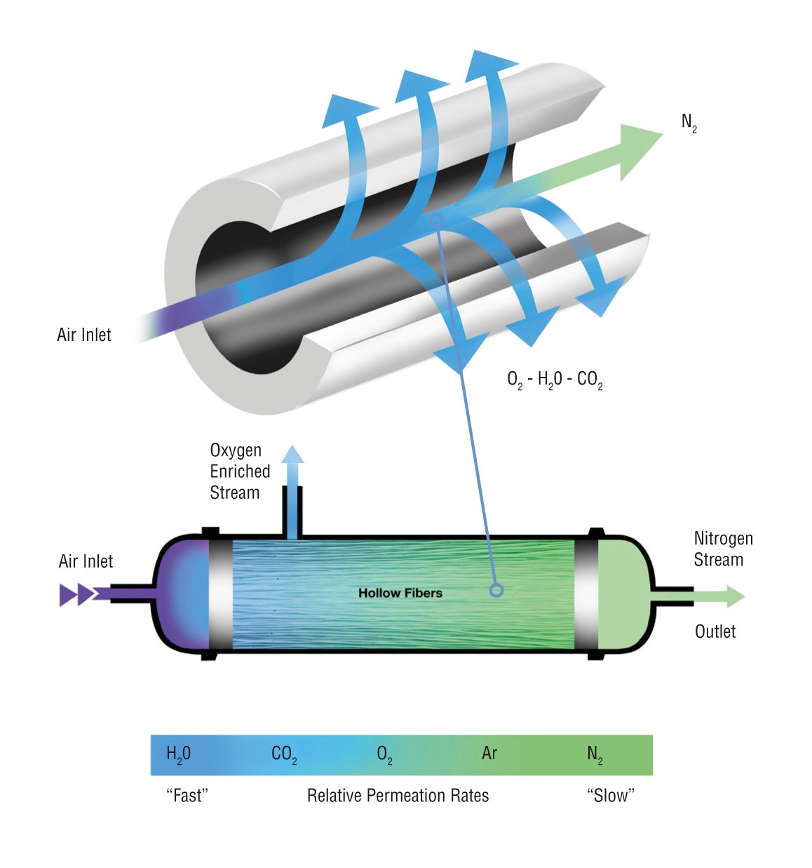 The membrane consists of a bundle of selectively permeable hollow fibers. It separates nitrogen from atmosphere by passing compressed air through the side wall of hollow polymer fibres. The process relies on the principle of selective gas permeation. Each gas has a different permeation rate, so as the compressed feed air stream passes across the membrane, gases with faster permeation rates like oxygen, carbon dioxide, and water vapor are released back into the atmosphere as waste gas (along with some nitrogen). The product nitrogen, now stripped of most of the oxygen and carbon dioxide, passes out the other end of the separator at a slightly lower pressure for collection or directly into your application.
