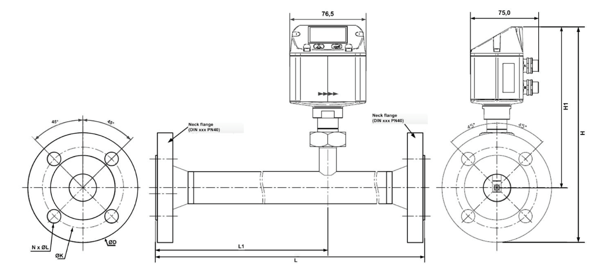 Flange Size | Pipe OD (mm) | Pipe ID (mm) | L (mm) | L1 (mm) | H (mm) | H1 (mm) | ØD (mm) | ØK (mm) | N x ØL (mm) |